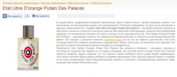В нашей жизни парфюмерия занимает практически самое главное место. Аромат женщины скажет о ее настроении, ее пристрастиях и даже о ее темпераменте. Психологи утверждают, что духи могут рассказать о девушке практически все. Парфюм Etat Libre D'orange Putain Des Palaces - это Ваша визитная карточка в мир элиты, нежность и мягкость этих духов сделает Вас приятной собеседницей, раскроет Ваш прекрасный характер, что непременно поможет не только в жизни, но и в карьерном росте. Этат Либре Д'оранж Putain Des Palaces – равномерно ложится на поверхность бархатистой кожи и остается на ней продолжительное время. Это говорит о высоком качестве туалетной воды, но не это ее главное достоинство. Etat Libre D'orange Putain Des Palaces изумительно подходит для любого типа кожи, не изменяет ноты аромата, что делает ее самой популярной в рейтинге продаж за последний год. Приобрести Этат Либре Д'оранж Putain Des Palaces Вы можете в Интернет - магазине, заглянув в популярные продажи, Вы увидите ее на первых позициях. Так как Etat Libre D'orange Putain Des Palaces является лидером, будьте уверены, что этот аромат займет любимое место среди Вашей парфюмерии. Этот запах наполнит Ваше сердце любовью, поднимет жизненный тонус, вдохнет радость жизни и покажет ее во всем великолепии. Ваша обворожительная улыбка в сочетании с незабываемым ароматом, будет козырем при любых обстоятельствах. (Отсюда.)