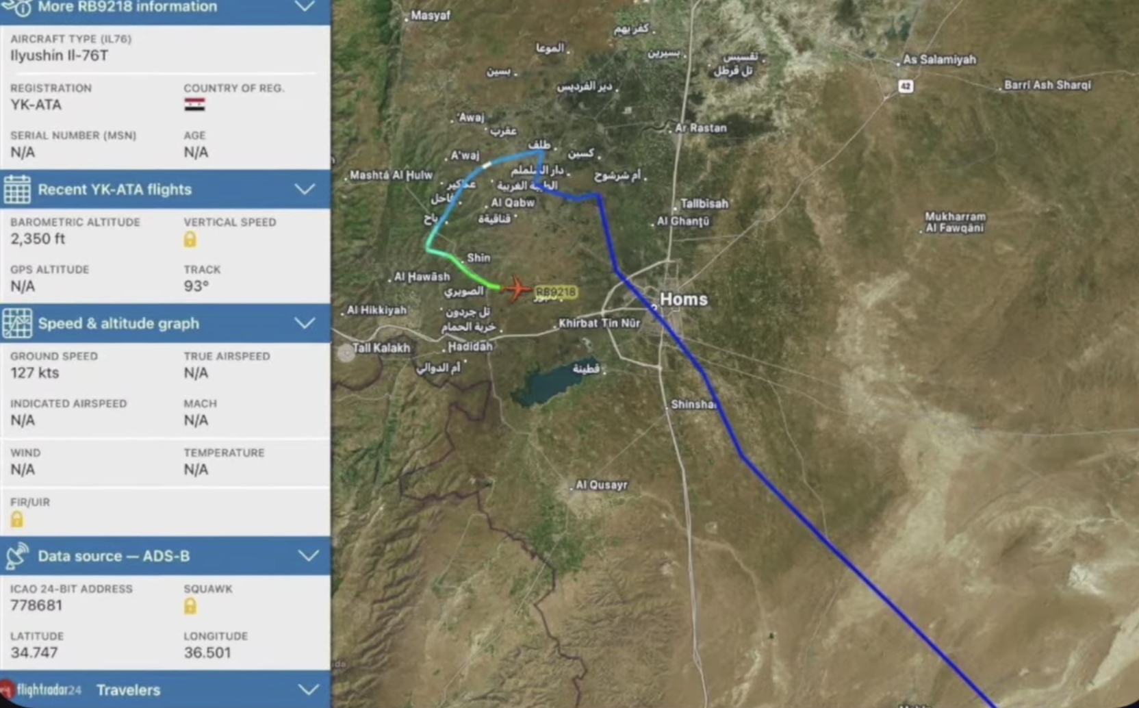 Согласно данным Flightradar24, самолет Ил-76 авиакомпании Syrian Air вылетел из Дамаска в 1:55 UTC (4:55 по сирийскому времени). Самолет направился в сторону прибрежных районов, где расположены российские авиа- и морская базы. В 2:32 UTC борт резко развернулся и начал снижаться. В 2:39 самолет пропал с радаров, в это время он находился на высоте 500 метров.
