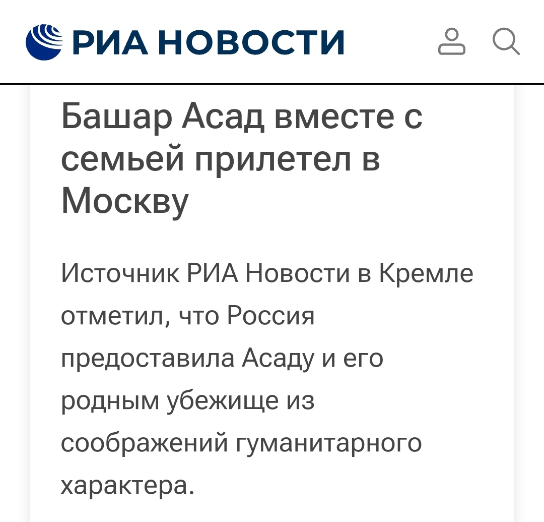 "Асад с членами своей семьи прибыл в Москву. Россия, исходя из соображений гуманитарного характера, предоставила им убежище", - цитирует агентство источник, не называя его по имени.