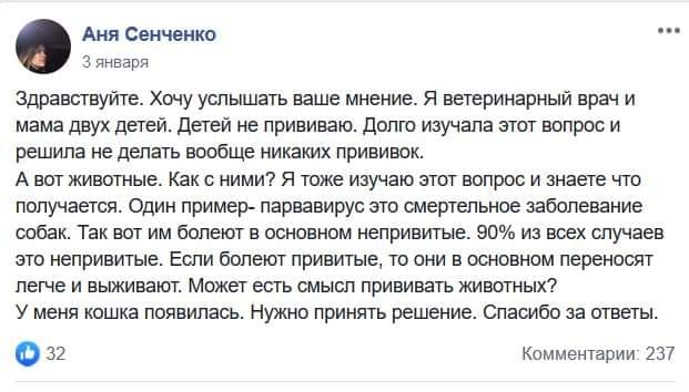 Upd: Отличный пример конкретной эбонутости антипрививочников. Начиталась всяких уродов, детей решила не прививать - пускай сами болеют и других заражают, не вопрос. Но так как она ветеринар, то животных-то, может, все-таки привить? Дети эбонутой мамаши пускай болеют и помирают, а собачек-то все-таки жалко, не так ли?