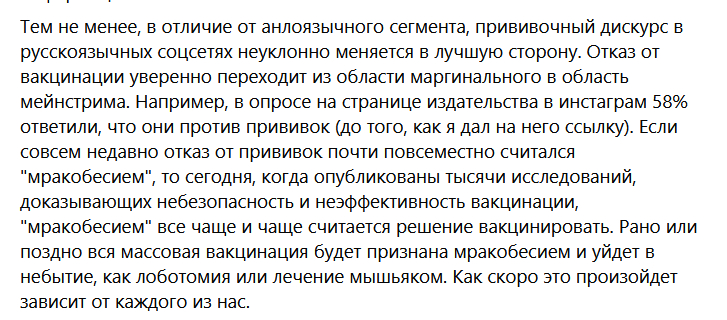 Нет, я понимаю, бабки не пахнут. Но зная о существующих проблемах с этими долбанутыми на всю голову антипрививочниками, с чьей любезной помощью сейчас снова возникают эпидемии заболеваний, с которыми человечество вроде бы справилось давным-давно, выпускать антипрививочную книжку этого долбанутого блогера-анонима Амантонио - это, ребята, уже совсем зашквар какой-то! Ладно бы продолжали публиковать книжки о том, что Земля плоская - это хоть на здоровье не влияет.