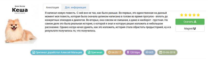 Олег Шубин (он уже озвучивал несколько моих повестей и мне очень нравится, что у него получилось) сделал аудиокнигу по моей повести "Кеша", за что ему большое спасибо. Повесть можно прочитать здесь (там же ссылки на версии в форматах электронных книг), а аудиокнигу можно послушать и скачать вот здесь.