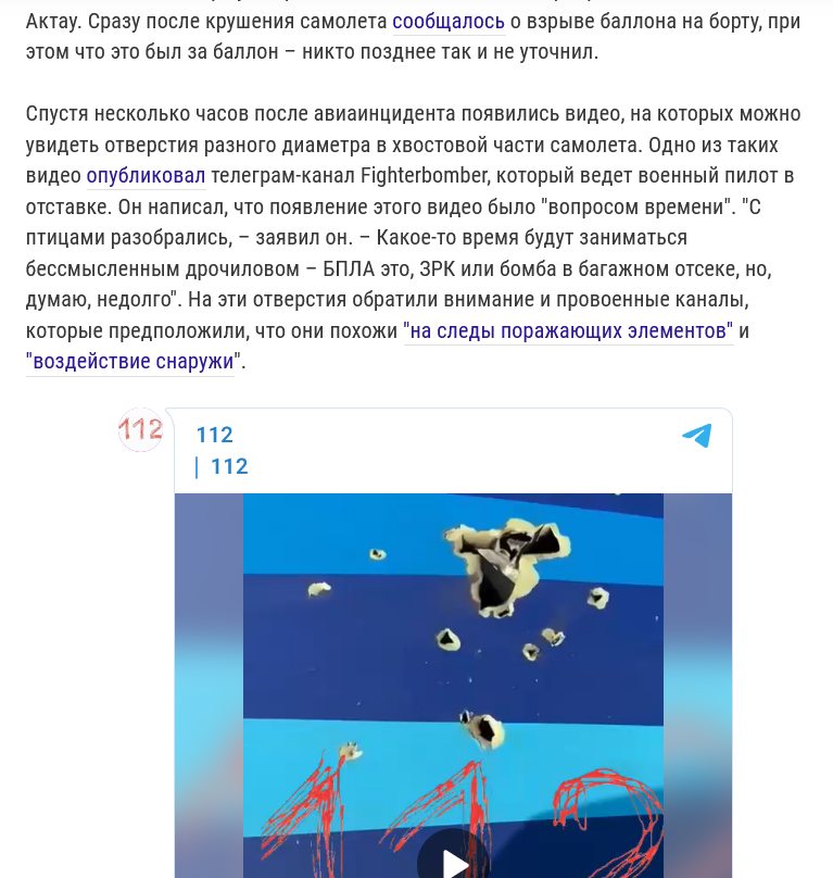 В общем окончательный, и довольно очевидный вердикт: "Панцирь" - у него зона поражения как раз близко от цели сзади, взрыв как минимум один (возможно - два), слева от хвоста (белая плоскость на видео - не вертикальная, а горизонтальная часть хвостового оперения, вертикальная - синяя, в нее поражающие элементы вошли почти перпендикулярно, в горизонтальную - под очень острым углом). Довольно точное направление взрыва можно определить по следам от поражающих элементов, которые прошли параллельно обшивки хвостовой части фюзеляжа и оставили на нем царапины или рваные поыреждения (на первом скрине). На уже опубликованных видео также хорошо видно, что вертикальная плоскость хвостового оперения была прошита насквозь, были повреждения левого крыла и внутри салона, включая ранение минимум одной пассажирки. Журналистам, кстати, уже запрещают брать интервью у выживших.