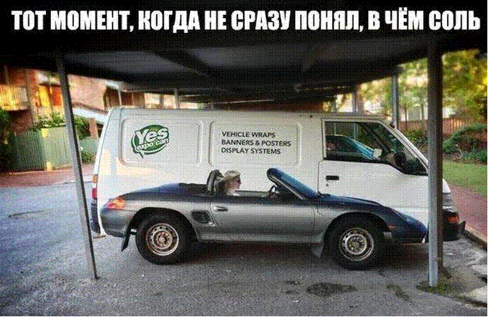 Я понял! Я понял в чём прикол! У половины фото горизонт завален, а у половины нет - смотрите, слева столбик у навеса тонкий и косой, а справа толстый и прямой - это стереоскопический теплый ламповый эффект полузаваленого горизонта! Кстати, а что на фото ещё и машина есть? Блин, сразу даже не заметил....