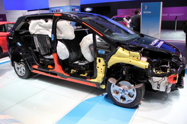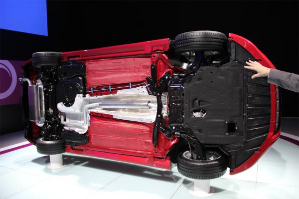 Еще на стенде "Форда" была интересная инсталляция - завалили "Фокус", чтобы можно было как следует разглядеть, что у него под брюшком.