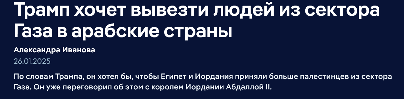 Да, прочитал. Ох, здоров мужик ставки задирать...Т.е. в Газе теперь всем будут управлять США? Неплохо, конечно. Надеюсь, никто не против?Я только не понял ещё, куда переведут всех палестинцев.