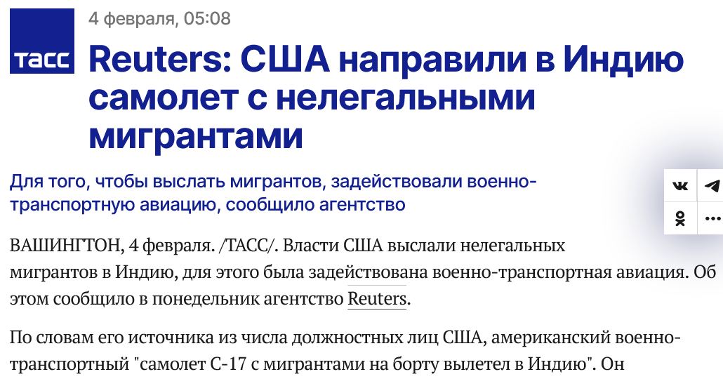 В конце января власти Колумбии согласились принять депортируемых из США нелегалов, после угроз Вашингтона ввести пошлины в 25% на колумбийские товары. Изначально Богота не пустила два военных самолета США, на борту которых находились около 160 человек. Колумбия вывезла депортированных из США мигрантов на своих самолетах и на всякий случай, сказала спасибо.
