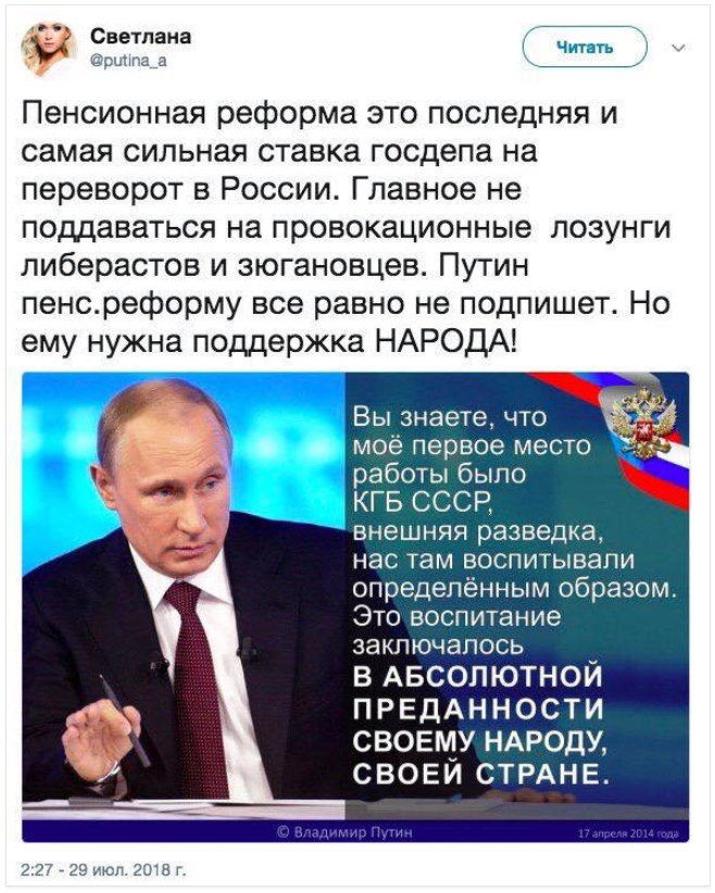 Далее - чисто моё "скромное мнение"... в Кремле сидят две группировки... уже ни для кого не секрет... что пенсионная реформа озвучена именно медведевской групировкой... говорит в пользу Путина