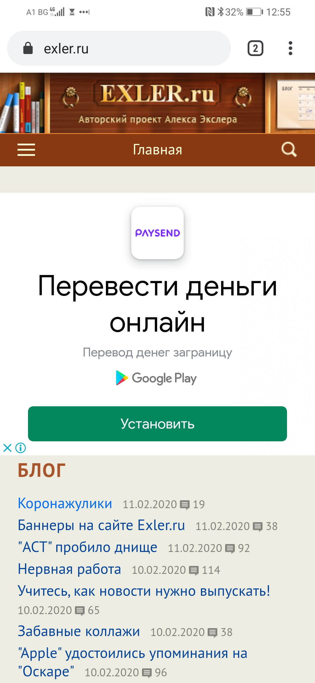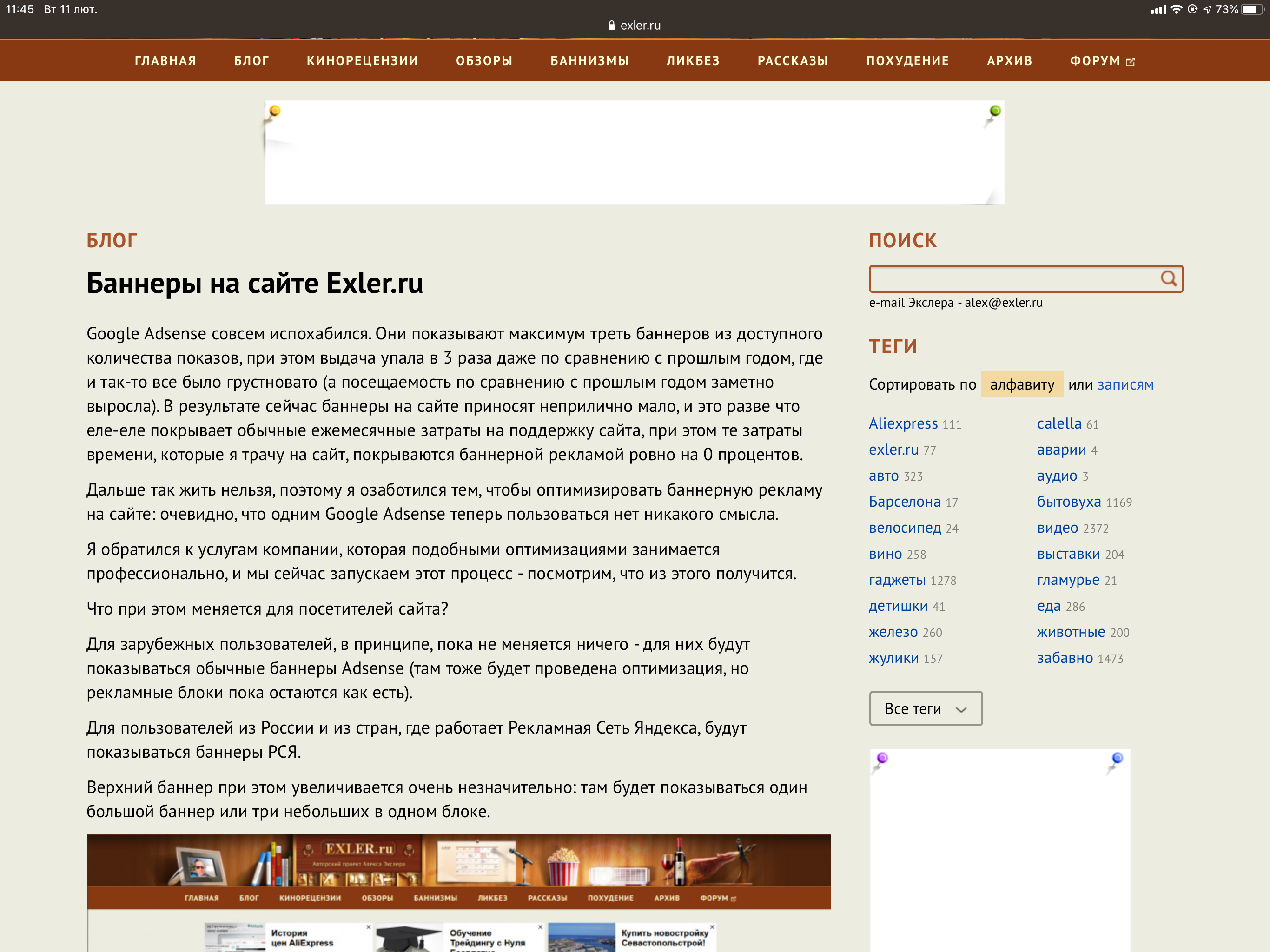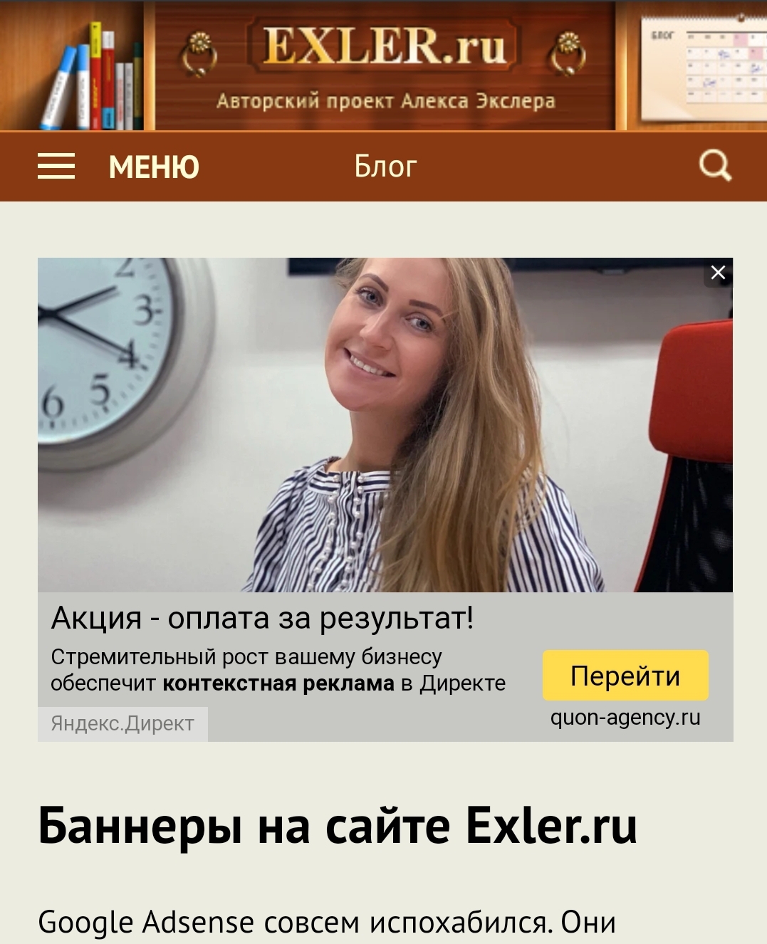 На мобильной версии сайта центральное место на экране отведено баннеру, как будто я не в блог зашёл, а деньги перевести в данном случае, реклама доминирует над самим контентом, баннер занимает большую площадь, чем сам блог