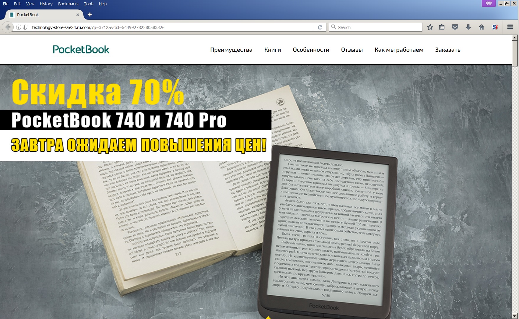 Например, сейчас мне отрекламировалось "продаём Покетбук 740 за 2990", со ссылкой на technology-store-sale24:ru:com (вместо точек поставил двоеточия), где "скидка 70%", что выглядит откровенным жульём.