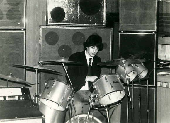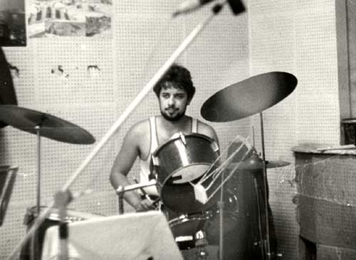 Нашел пару фоток из своей барабанной юности. Первая - репетиционная база в ДК "МАИ", 1983 год. Барабаны концертные, на них перед нами играла маевская эксцентрик-группа "Бим-Бом", которая потом ушла в профессионалы. Я тогда тащился: для тех лет установка была просто супер-экстра-мега-кул - Amati.