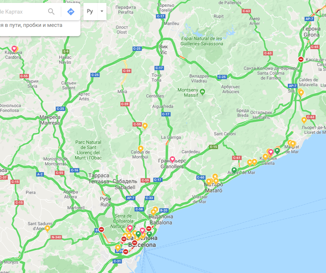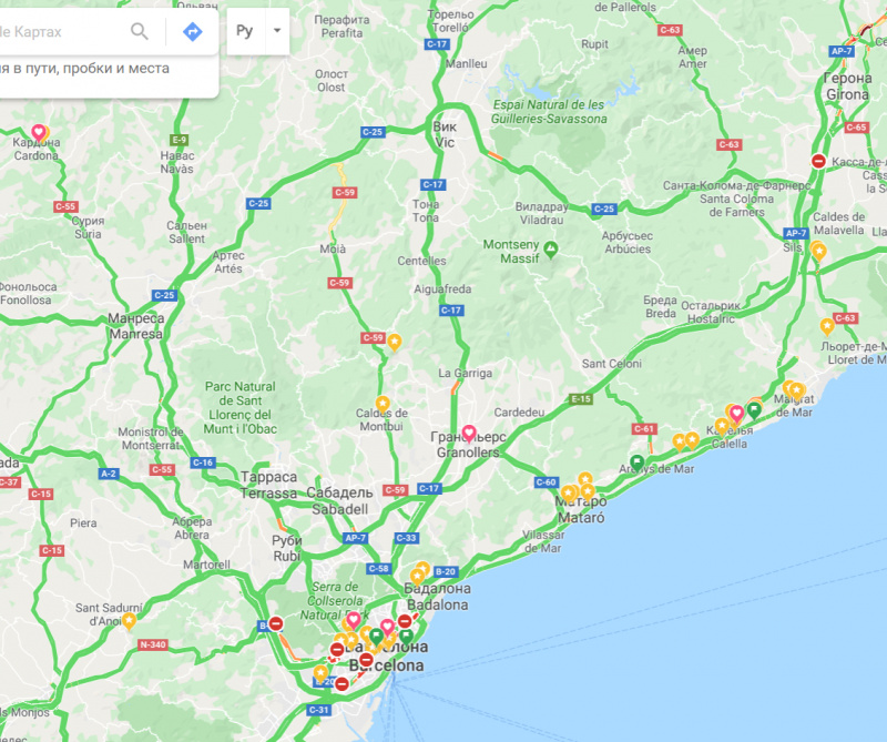 Вне Барселоны - все спокойно: видать все марши пришли в Барселону и сейчас там зажигают. Вне Барселоны я вижу только один перекрытый съезд с AP-7 недалеко от Жироны. В самой Жироне все чисто - я думаю, что главные жиронские сепаратисты сейчас в Барселоне.