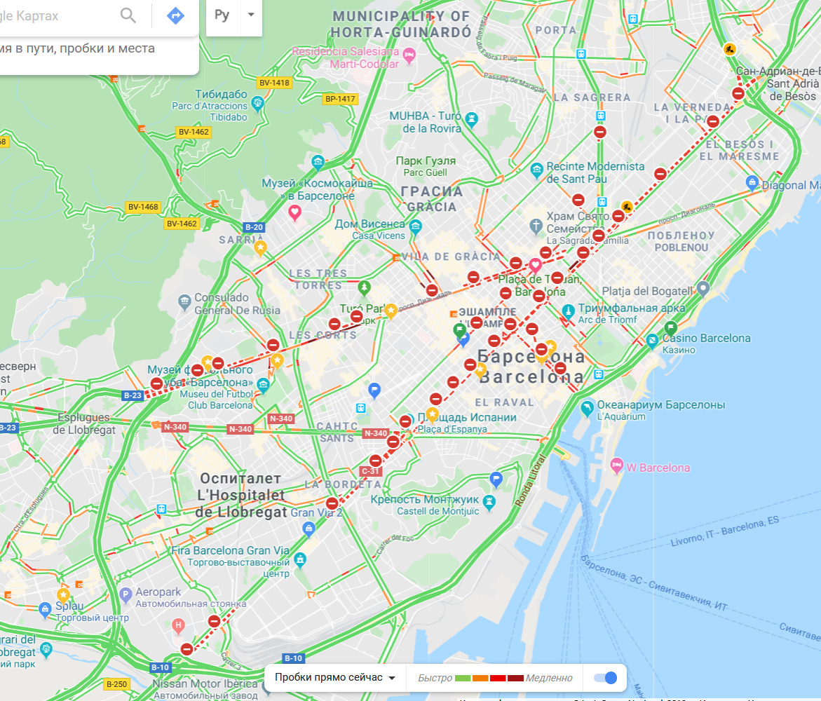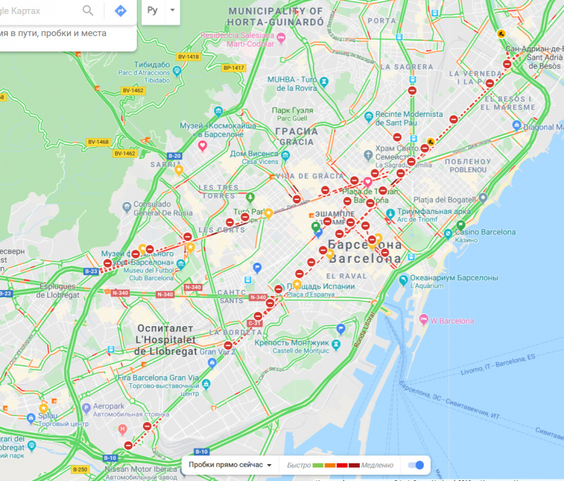 Барселону сегодня некисло так перекрыли: практически целиком заблокированы Гран Виа и Диагональ - это две основные транспортные артерии города.