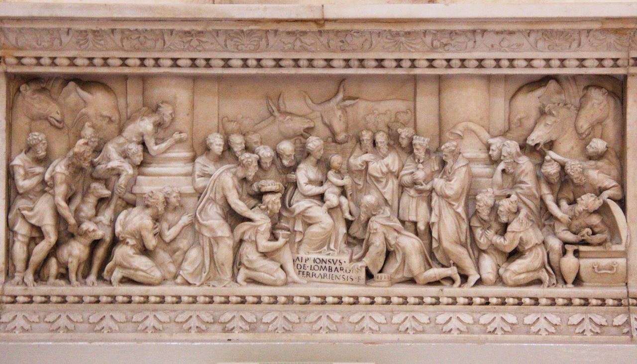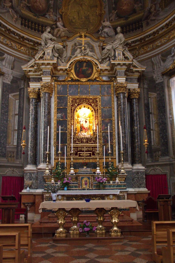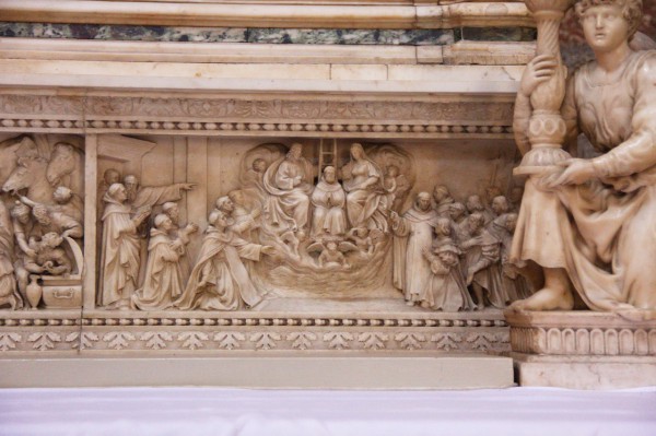 По бокам вдоль базилики идут капеллы - по 12 с каждой стороны. Когда-то они принадлежали или богатым семьям, или гильдиям. Теперь капеллы с их содержимым принадлежат ордену доминиканцев. Вот алтарь в одной из капелл.