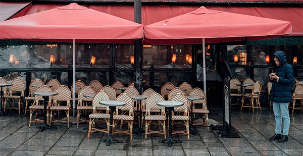 Прелестное фото в заголовке. Достойно уровня современной российской пропаганды. Судя по одеянию женщины, погода не просто прохладная, а холодная. Также видно, что идёт или недавно прошёл дождь. И почему это столики на улице пустые? Не иначе потому, что все французы разом обнищали.