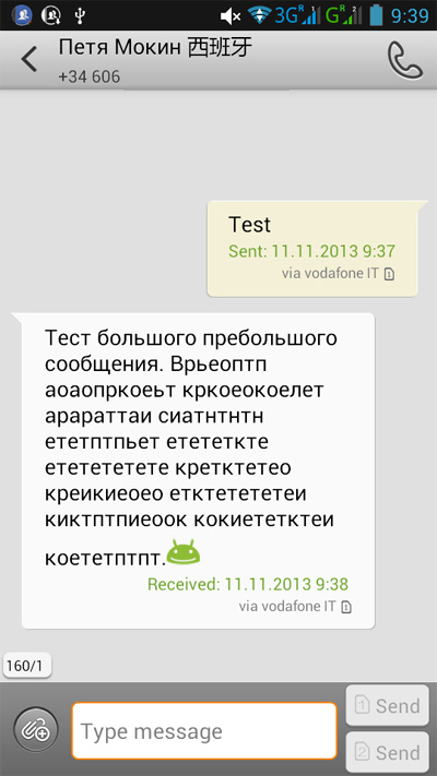 Upd2: Народ тут высказал предложение, что это у меня телефон кривой - разрывает SMS на несколько частей. Отвечаю. Во-первых, эти куски SMS приходили с разрывом в 2 минуты - это хорошо видно по времени доставки. Телефон такого делать не может - ему просто присылали кусками. Во-вторых, с другого телефона отправил на него длинное сообщение - все нормально пришло.