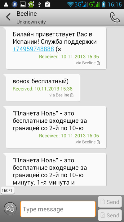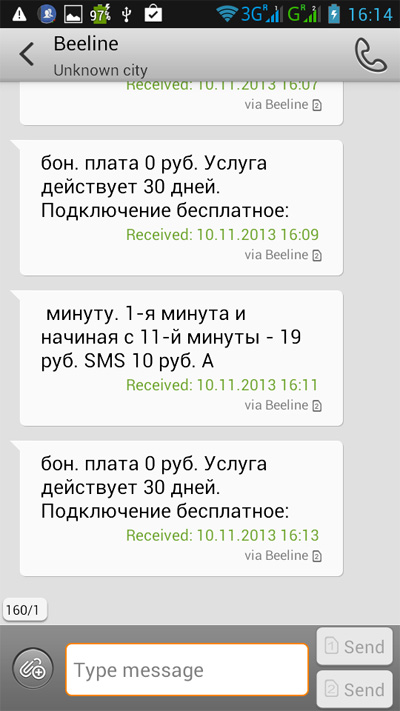 Вставил в смартфон, который я тестирую, запасную билайновскую симку. И понеслось: каждые две минуты Beeline мне шлет по сообщению, причем их как-то так странно режет, что продолжение приходит минуты через две после поступления начала. Вон, уже десяток сообщений прислали за последние 15 минут - достали.