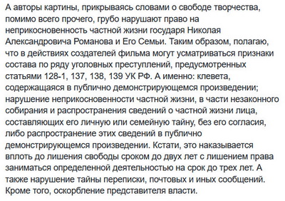 Оскорбление действующего представителя власти при исполнении служебных обязанностей (или в связи с их исполнением). Гражданин Романов на момент выхода фильма никаким представителем власти уже сто лет (буквально) как не являлся. Крмое того, очень сложно оскорбить покойника - это понятие применяется только к живым лицам. Как и прочие упомянутые составы, кстати - тоже (вот сюрприз) в качестве об'екта рассматривают только живых лиц. Вот незадача ... Ну я уж молчу, что это по архивным документам, выложенным в публичный доступ - какое уж тут вмешательство в частную жизнь.