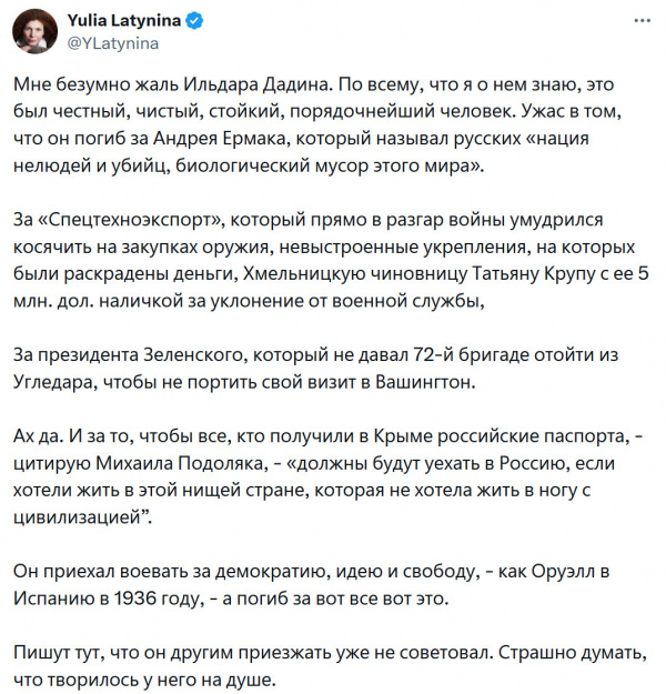 Беспощадная обличительница укро-нацистского жидо-бондеровского режима еврейских наркоманов Юля Латынина не могла не откликнуться на смерть Ильдара Дадина. За что умер Ильдар, спрашивает сама себя Юля? И дает честный ответ. Еще и укрепления не построили, чертовы укропы. Юля им полтора года назад велела укрепления строить. Так и не послушали.