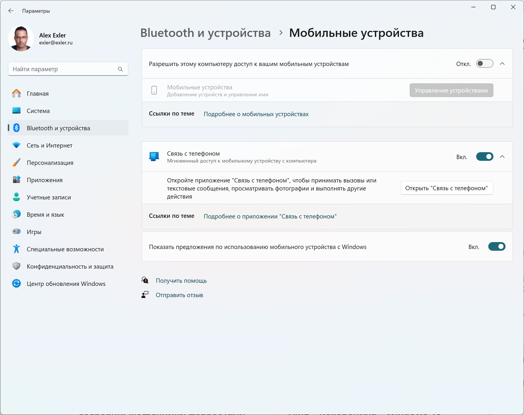 Правда, прямо в Проводнике подключенный смартфон как отдельное устройство пока не появился (но должен появиться в ближайшее время), но с помощью Link to Windows и при включении соответствующих настроек в разделе настройки Bluetooth на ПК теперь возможна полноценная работа со смартфоном по беспроводному соединению, включая звонки, чтение и отправка SMS, работа с фотографиями на смартфоне и запуск приложений на смартфоне.