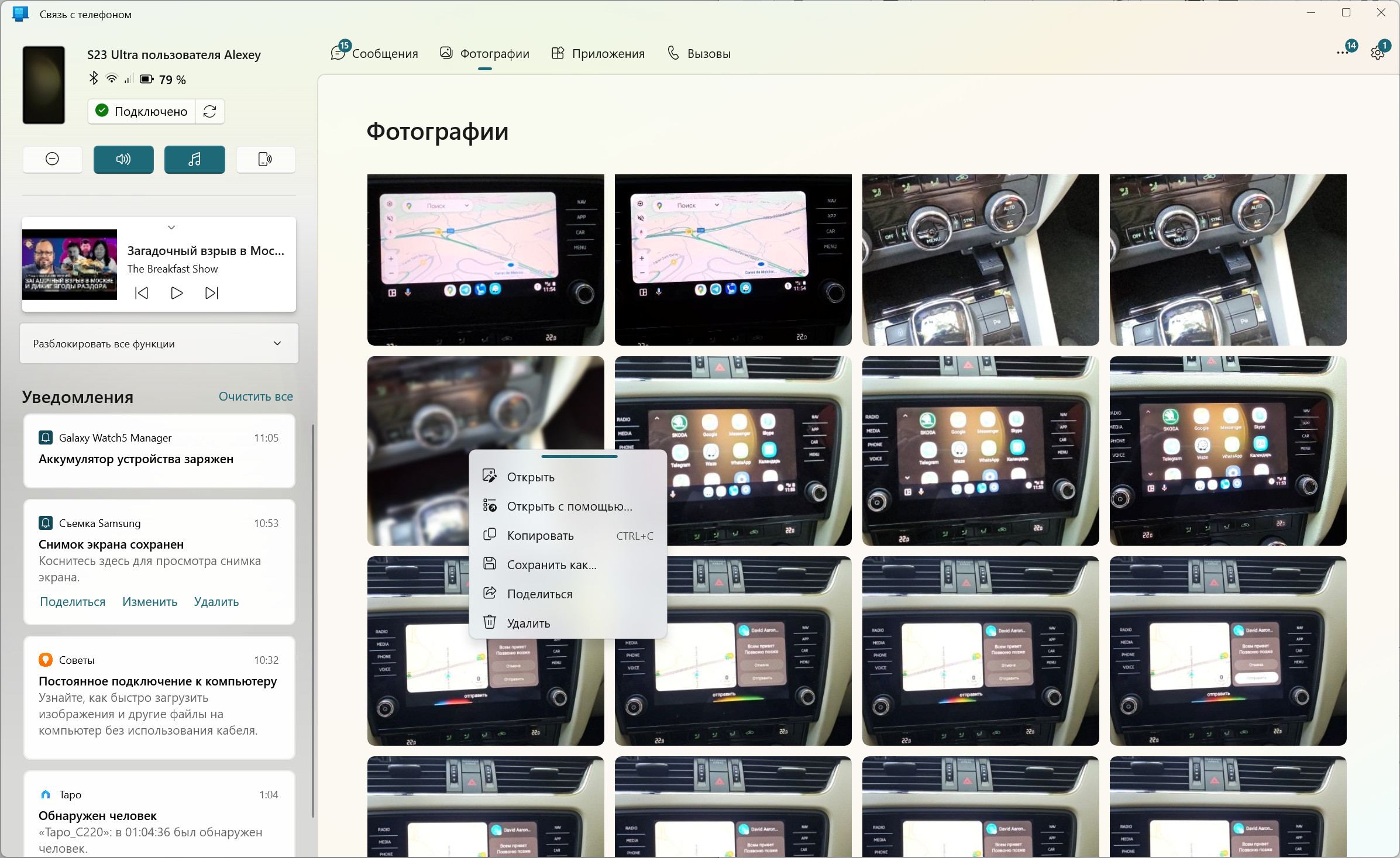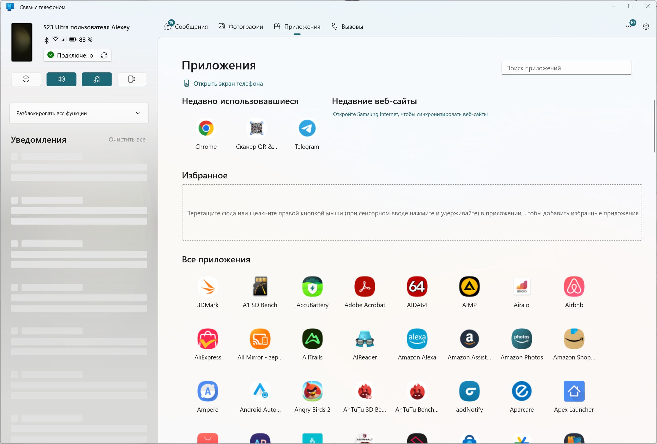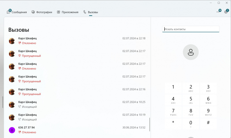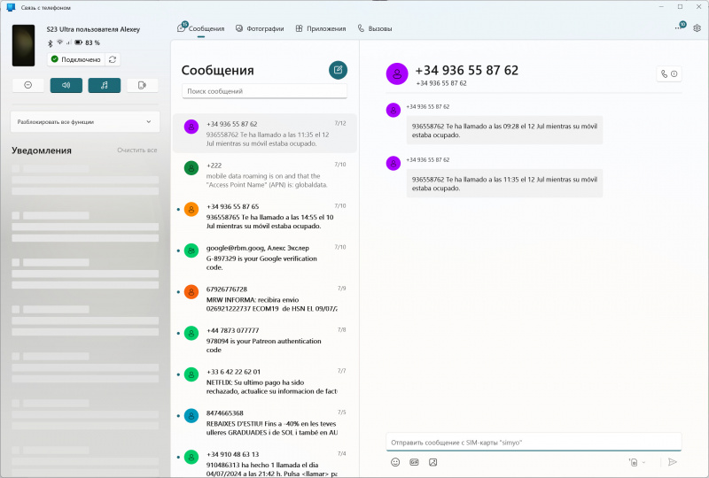 Теперь заходим в приложение "Связь с телефоном". И вот там есть вообще всё - сообщения, фотографии, приложения и вызовы.