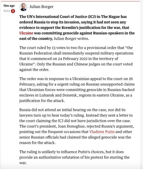 Международный суд ООН Гааги предписал России остановить вторжение, поскольку не видит ничего, что подтвердило бы аргументы Кремля в пользу войны, а именно что Украина совершала геноцид русскоязычных в восточных регионах страны.