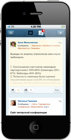 В приложении собраны только самые важные функции сервиса – возможность обмениваться информацией с коллегами и быть в курсе происходящего в компании.