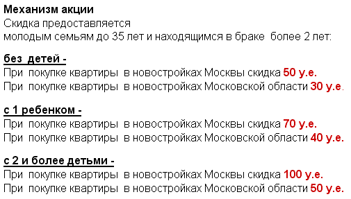 На сайте "Главмосстрой недвижимость" - совершенно потрясающая скидочная акция. Причем акция не просто так, а в поддержку правительственной программы «Молодая семья». Вот такие вот сумасшедшие скидки - торопитесь!