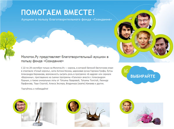 В пользу благотворительного фонда "Созидание" на "Молотке" с 22 по 29 сентября проводится благотворительный аукцион "Помогаем вместе". Там выставлены - корона, в которой Евгений Евстигнеев играл в спектакле «Голый король», кипа Антона Носика, шариковая ручка Германа Грефа, бутсы Александра Кержакова, возможность сыграть роль в программе «6 кадров» или сериале «Воронины», приглашение на съемки программы «Галилео» вместе с Александром Пушным, а также уникальные лоты от Татьяны Лазаревой, Татьяны Толстой, Леонида Парфенова, Таши Строгой, Алекса Экслера, Владимира (soamo) Камаева и других.