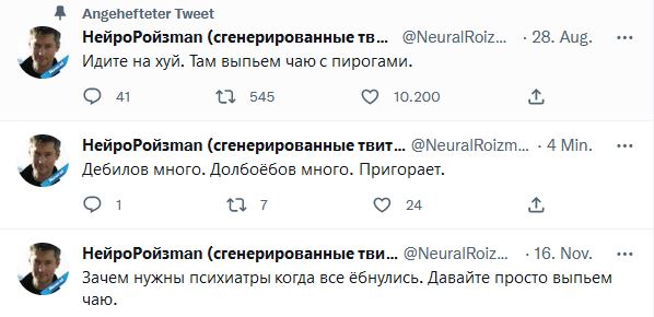 Тут народ создал твиттер-канал НейроРойзман, в котором нейросети постят твиты в стиле Ройзмана.