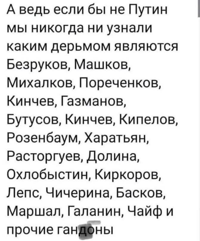 Какие же они все-таки гниды, все эти подмахивающие и подлизывающие этому подлому и преступному путинскому режиму актеры, музыканты и прочая творческая продажная сволочь.
