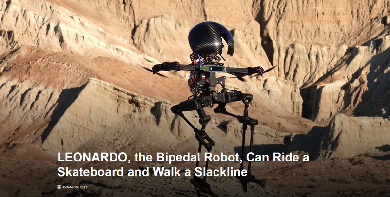 Назвали его LEONARDO (сокращенно от «LEgs ONboARD drOne» или сокращенно LEO) может ходить по натянутой веревке, прыгать и даже кататься на скейтборде. Разработанный командой Центра автономных систем и технологий (CAST) Калифорнийского технологического института, LEO является первым роботом, который использует многосуставные опоры и двигатели на основе пропеллера для достижения точной степени контроля над балансом.