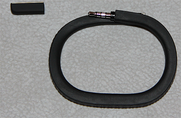 С одного торца браслета - кнопка управления, которую нужно нажимать, например, перед сном. На другом конце - заглушка, под которой находится штекер для подключения к айфону через наушниковый выход или для подключения к USB для зарядки.