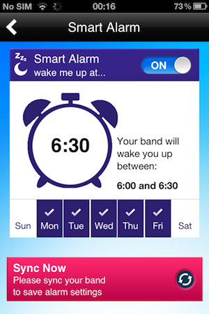 Перед сном браслет нужно перевести в специальный режим с помощью нажатия кнопки (я об этом не знал и в первую ночь использования браслета проспал совершенно впустую), после чего браслет будет отслеживать различные фазы вашего сна. Как соответствующий бонус - возможность установить диапазон времени для срабатывания будильника (как правило, это полчаса), чтобы браслет разбудил вас нежной вибрацией в наиболее подходящую фазу сна. Только выставлять будильник приходится на айфоне, а потом синхронизировать это все с браслетом.