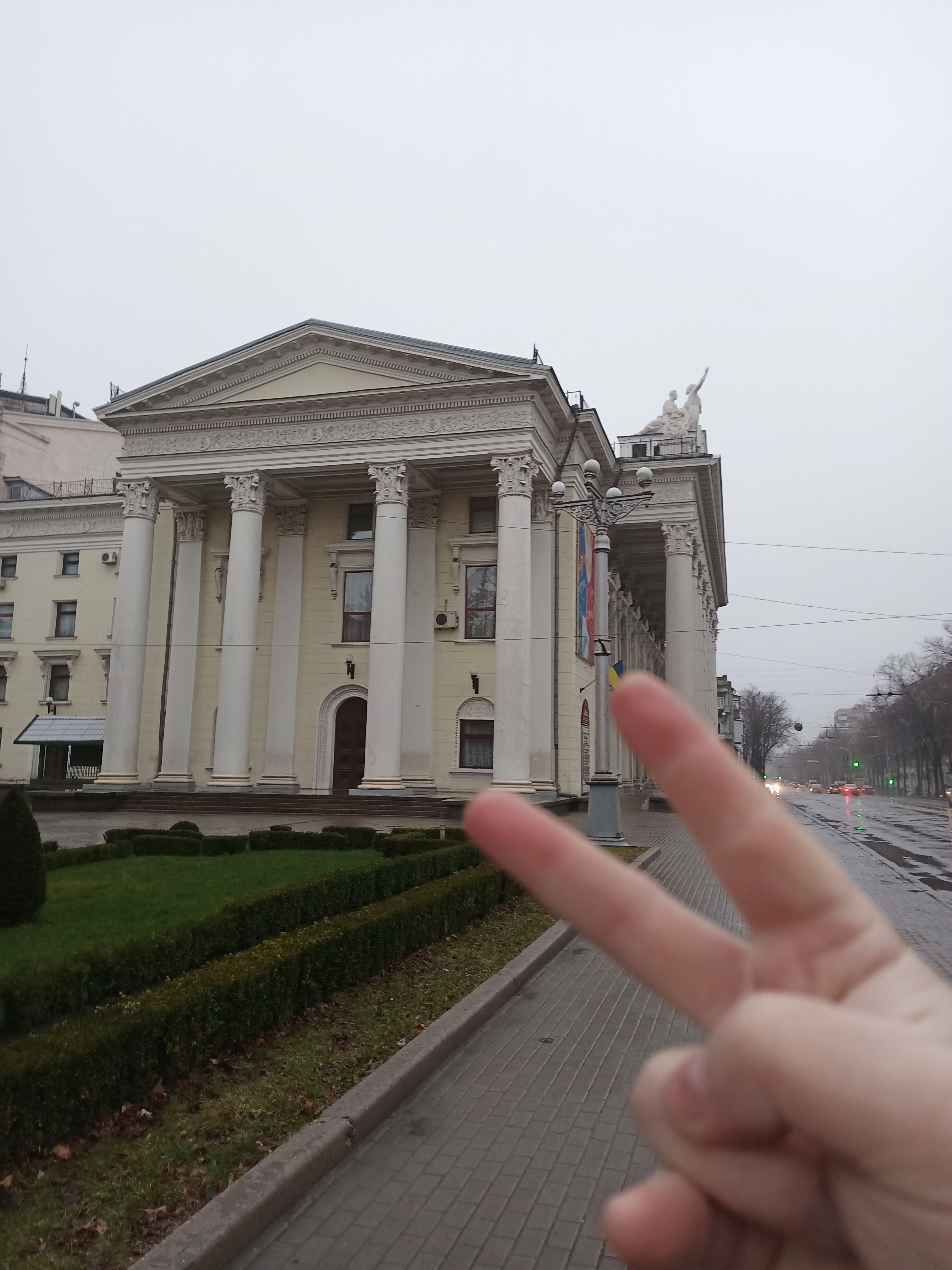 Кстати, давно хотел показать эту фотку. После твоего последнего на меня наезда, я вышел и сделал её. Хотел, конечно, передать привет другим жестом, но нас могут смотреть дети, поэтому пусть это будет символ нашей будущей Перемоги. На заднем плане - Запорізький обласний академічний український музично-драматичний театр ім. В. Г. Магара в Запоріжжі