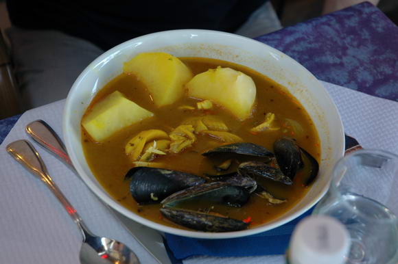 Но потом принесли наш буйабес. Взрослый. А это - совершенно другой коленкор. Четыре вида рыбы, гигантские креветки (у моей не хватало одного уса - он пошел в буйабес Каганова), мидии, картошка.