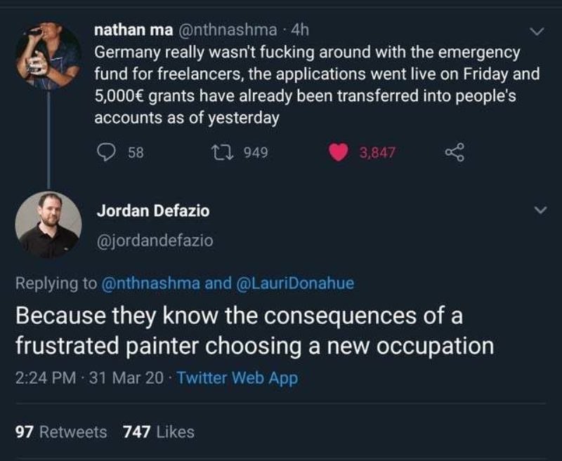 Куча людей уже поувольняли. В одной знакомой компании , не маленькой, ещё в начале прошлой неделе уволили 250 кассиров. Не стали ждать. не знаю, может эта компания не продержалась бы месяц, но что-то мне подсказывает, просто похрену на людей. А потом государство будет помогать этим крупных компаниям, аргументируя, что им бедным нужна финансовая поддержка. (((