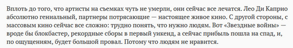 Не понимаю, а что он не так говорит? Если его не берут играть в шедеврах, то это не значит, что он не может говорить правду про прокат SW в России. И для этой саги это ожидаемо, что спад после недели проката будет очень большой, слишком долго ждали, а прокат с первых дней был очень широкий, во всех залах сутками крутили. А кто не ждал, те и смотреть не будут. И будет провал, когда фильм будет в прокате, а залы будут пустыми. Просто неравномерный спрос, в отличии от обычных блокбастеров. Провал не в смысле фильм провальный, а в смысле что сборы почти не будут расти. И про массовое кино верно говорит. Может дело в том, что я не сомтрел фильмов с Безруковым и воспринимаю его слова как слова обычного человека, ходящего в кино?
