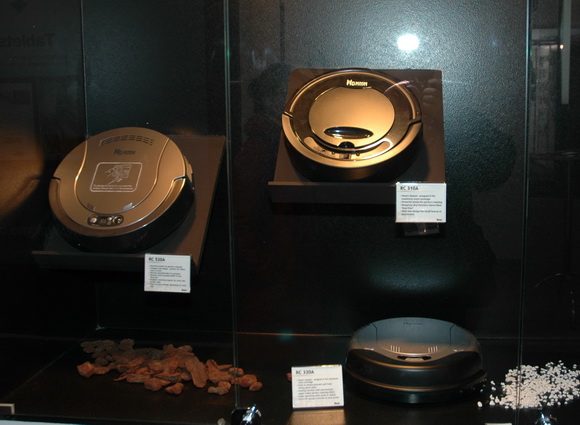 Роботы-пылесосы фирмы Agama. Я похожий обозревал. Кстати, стендик был бедненький. Ни тебе демонстраций, ни тебе объяснений. Просто лежат на витрине пылесосы с табличками.