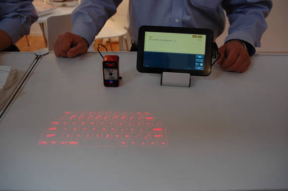 Проекционная клавиатура. Их выпускают уже лет десять, и я никогда их не видел в продаже. Наверное, потому, что реально пользоваться этой штукой - невозможно. Экранная клавиатура удобнее на порядок. Так что это просто любопытный концепт. Который никогда не выйдет за пределы выставок.