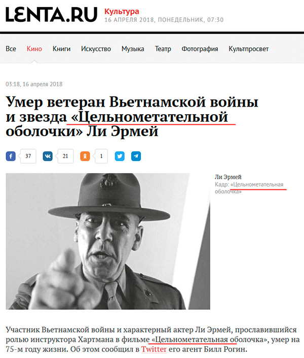 Честно сказать, мне "Цельнометаллическая оболочка" кажется самым слабым фильмом Кубрика и кроме роли Эрмея ничего выдающегося в этой проходной картине нет. (имелось в виду - проходной по меркам Стэнли Кубрика). В любом случае, RIP!