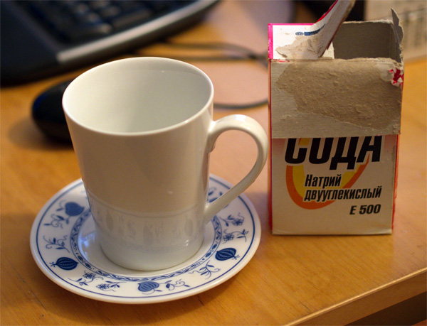 В какой-то из старых повестей прочитал забавную фразу: "У тебя чашка из-под чая выглядит так, как будто пищевую соду еще не изобрели". Фраза тогда произвела такое впечатление, что я, как заядлый чаеман (я в течение дня пью 6-10 чашек чая), после этого всегда держу рядом пачку соды - оттирать чашку.