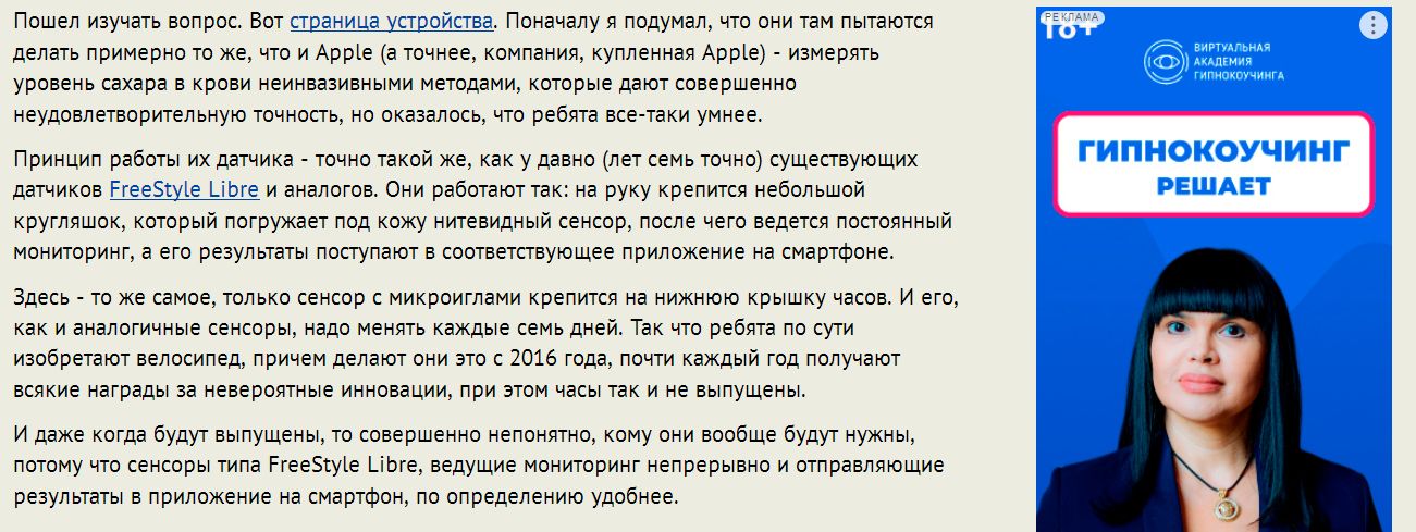 Здесь - то же самое, только сенсор с микроиглами крепится на нижнюю крышку часов. И его, как и аналогичные сенсоры, надо менять каждые семь дней. Так что ребята по сути изобретают велосипед, причем делают они это с 2016 года, почти каждый год получают всякие награды за невероятные инновации, при этом часы так и не выпущены.