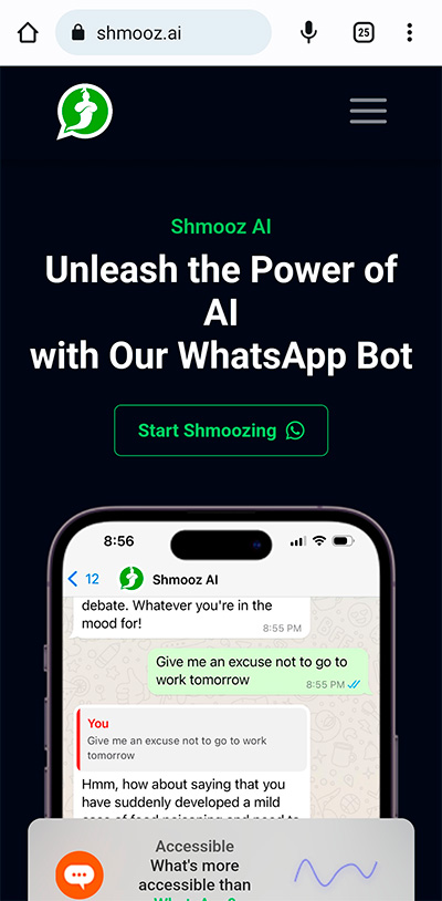 Кто хочет его попробовать - подключиться очень просто. Заходите в смартфоне (или на ПК, если там установлен клиент WhatsApp) на сайт Shmooz.Ai.