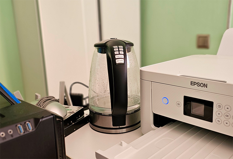Заменил на вот такой чайник, у которого есть поддерживание температуры на определенном уровне. Его можно поставить рядом с компом, что удобно. Пользовался несколько месяцев, но и он надоел: когда включаешь режим поддержания температуры, он периодически шумит (намного чаще, чем термопот). А если просто нагревать воду и все, то потом приходится ждать, когда нагреет, и это неэкономично, потому что воды надо граммов 100, а нагревается при этом 1,5-2 литра.