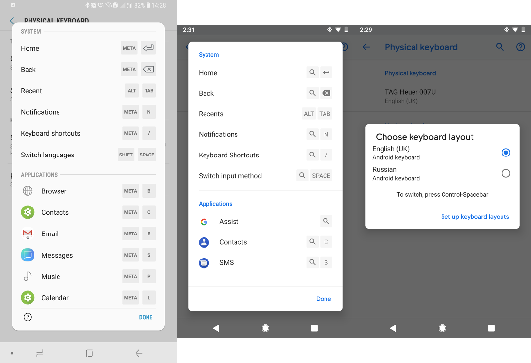 В первом случае Galaxy S9+ на Oreo, во втором — Pixel 2 на Pie. Клавиатура любая, хоть проводная, хоть Bluetooth (под капотом у них один и тот же протокол).