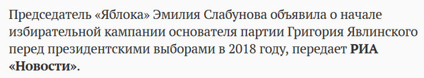 В то же время основатель «Яблока» и глава федерального политкомитета партии говорит, что его оппонентом на этих выборах будет Владимир Путин. отсюда