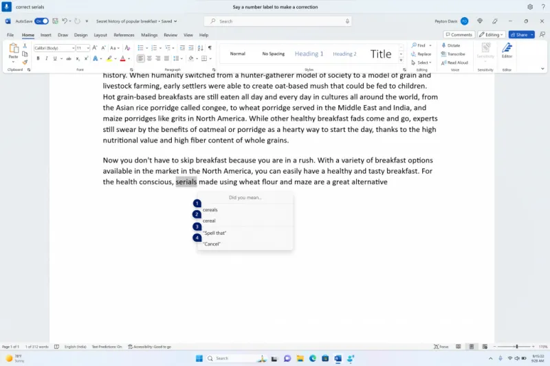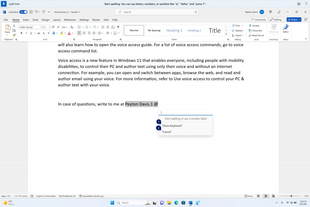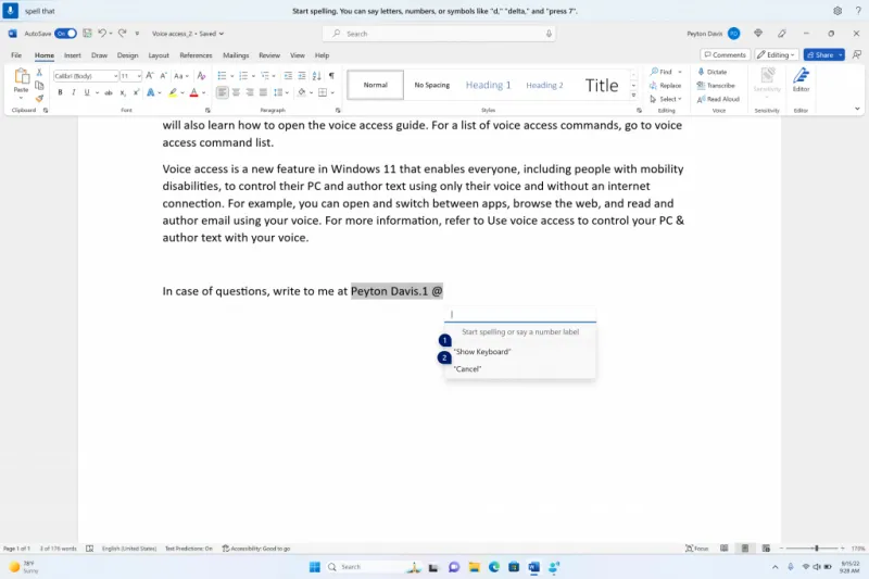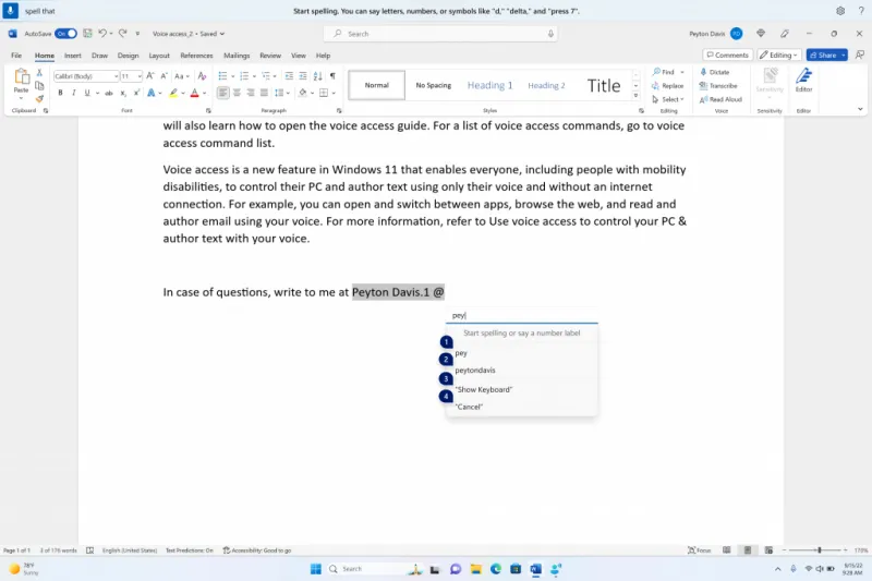 Для диктовки правильного написания нестандартных слов, таких как имена пользователей, темы и т.д., можно будет напрямую использовать команду "прописать это" или "прописать".  Появится окно написания, в котором можно диктовать буквы, цифры, символы, фонетический алфавит и т.д. По мере написания текста появляются предложения. Там можно сказать "нажмите 1", чтобы ввести написанный текст, или "нажмите [номер]", чтобы выбрать предложение (если оно есть). Все слова и фразы, надиктованные с помощью орфографического опыта, добавляются в словарь Windows и отображаются в качестве предложений при следующей попытке набрать текст по буквам.