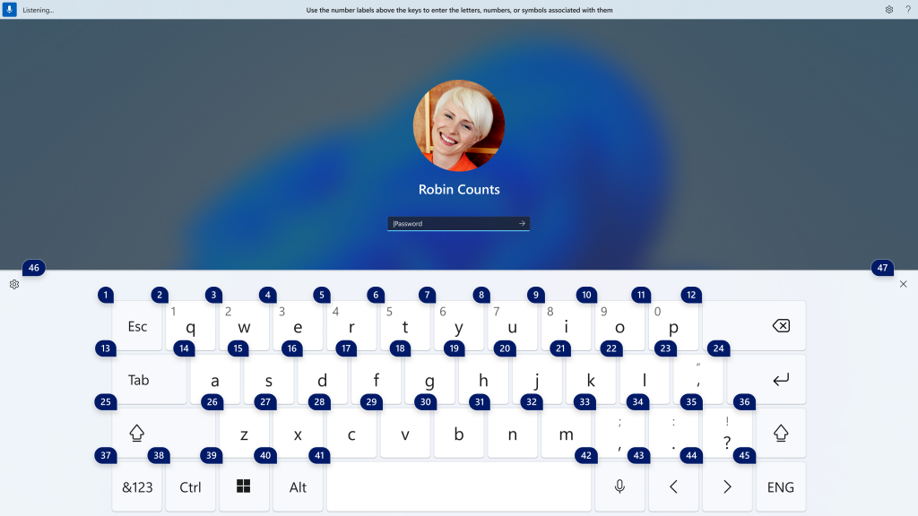Кроме того, можно сказать "показать клавиатуру", чтобы вызвать сенсорную клавиатуру с цифровыми метками. Можно произнести цифры на клавишах, чтобы ввести соответствующие им буквы. При этом вводимый пароль будет скрыт от посторонних глаз.