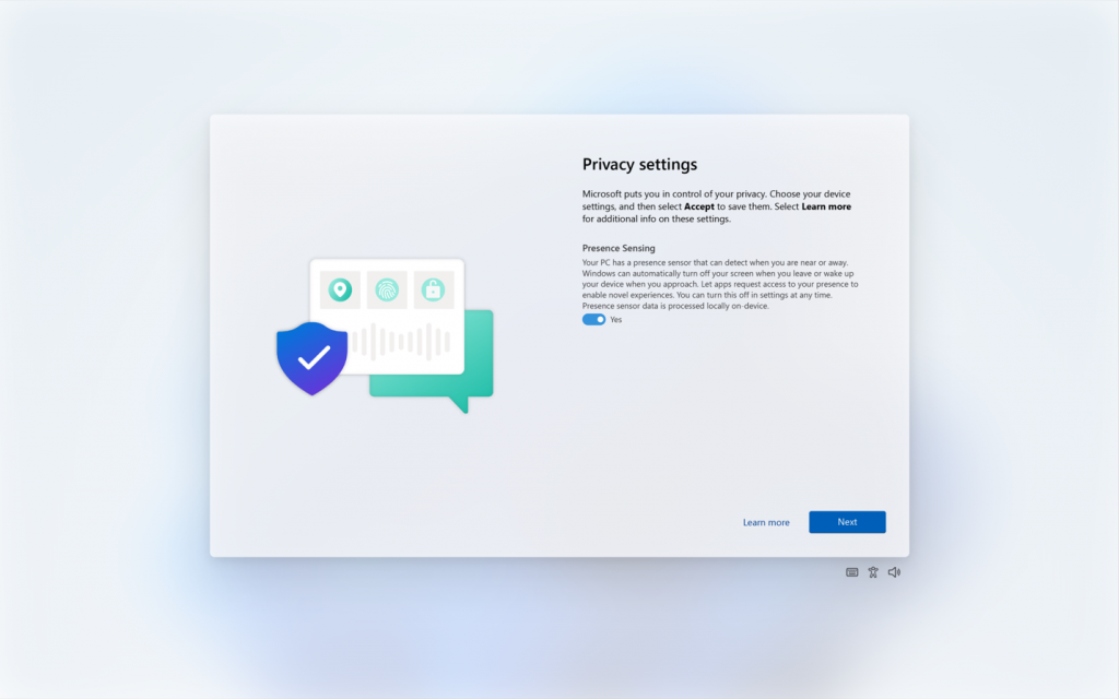 Пробуждение при приближении, блокировка при уходе, адаптивная регулировка яркости - все это работает на основе технологии присутствия в Windows, и теперь ее можно включить в процессе настройки OOBE (Out of box experience) при выборе параметров конфиденциальности для устройства.